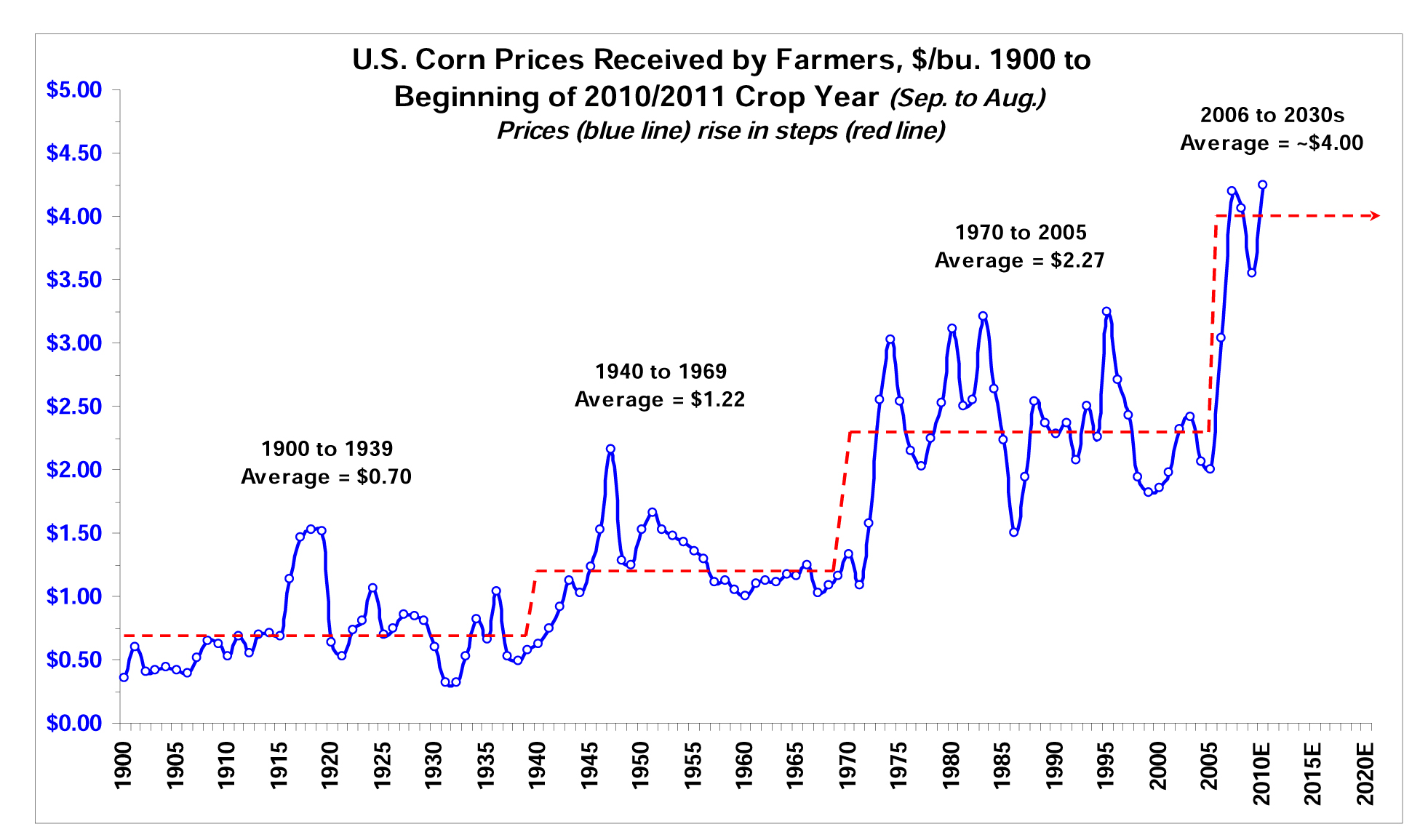 Story: Corn prices have historically risen in stepwise jumps rather than gradual increases, with structural breaks around 1940, 1970, and 2006. Each break led to a new, higher average price level.