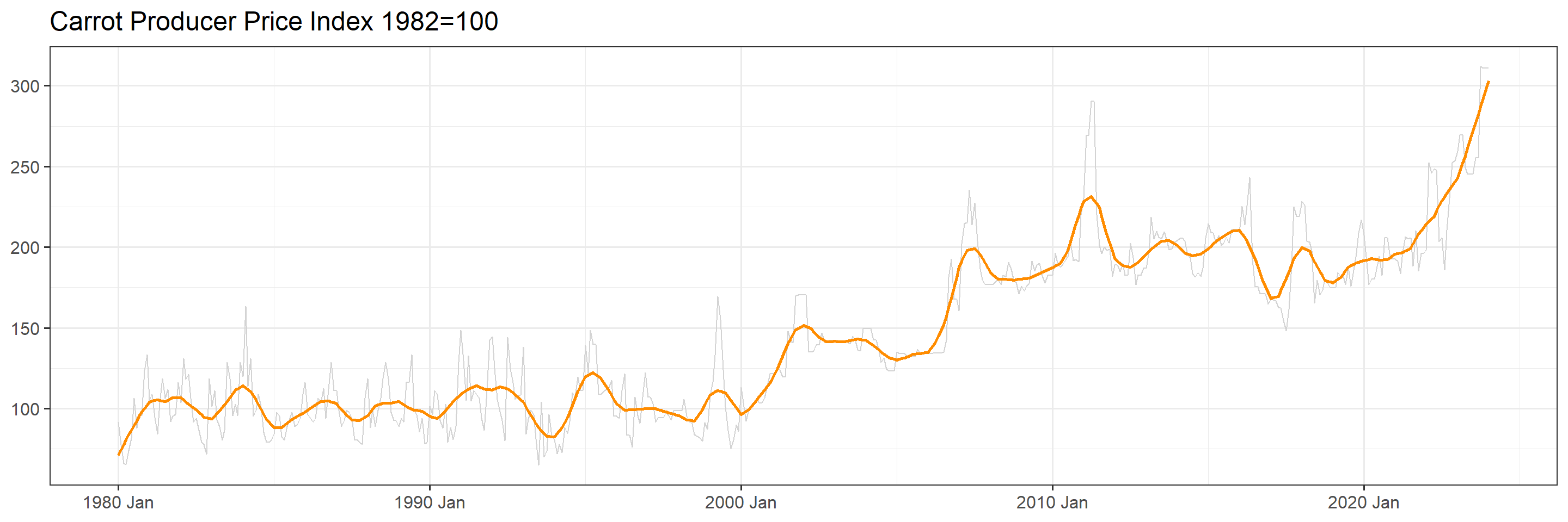 The data report historical prices for carrots from 1980 to 2023.