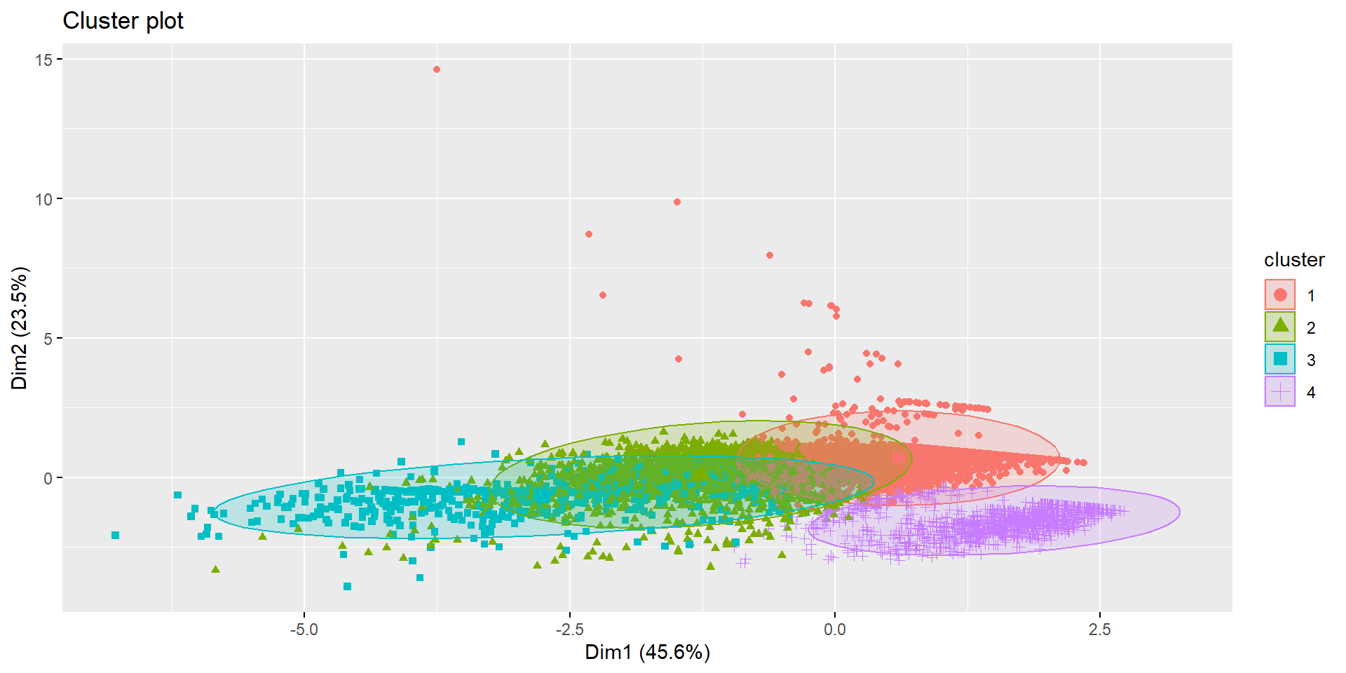 # Perform k-means clustering on logged and scaled dataset.seed(123)kmeans_fit <-kmeans(cluster_scaled, centers =4, nstart =25)# Add cluster to datasetfinal_dataset$cluster <-factor(kmeans_fit$cluster)