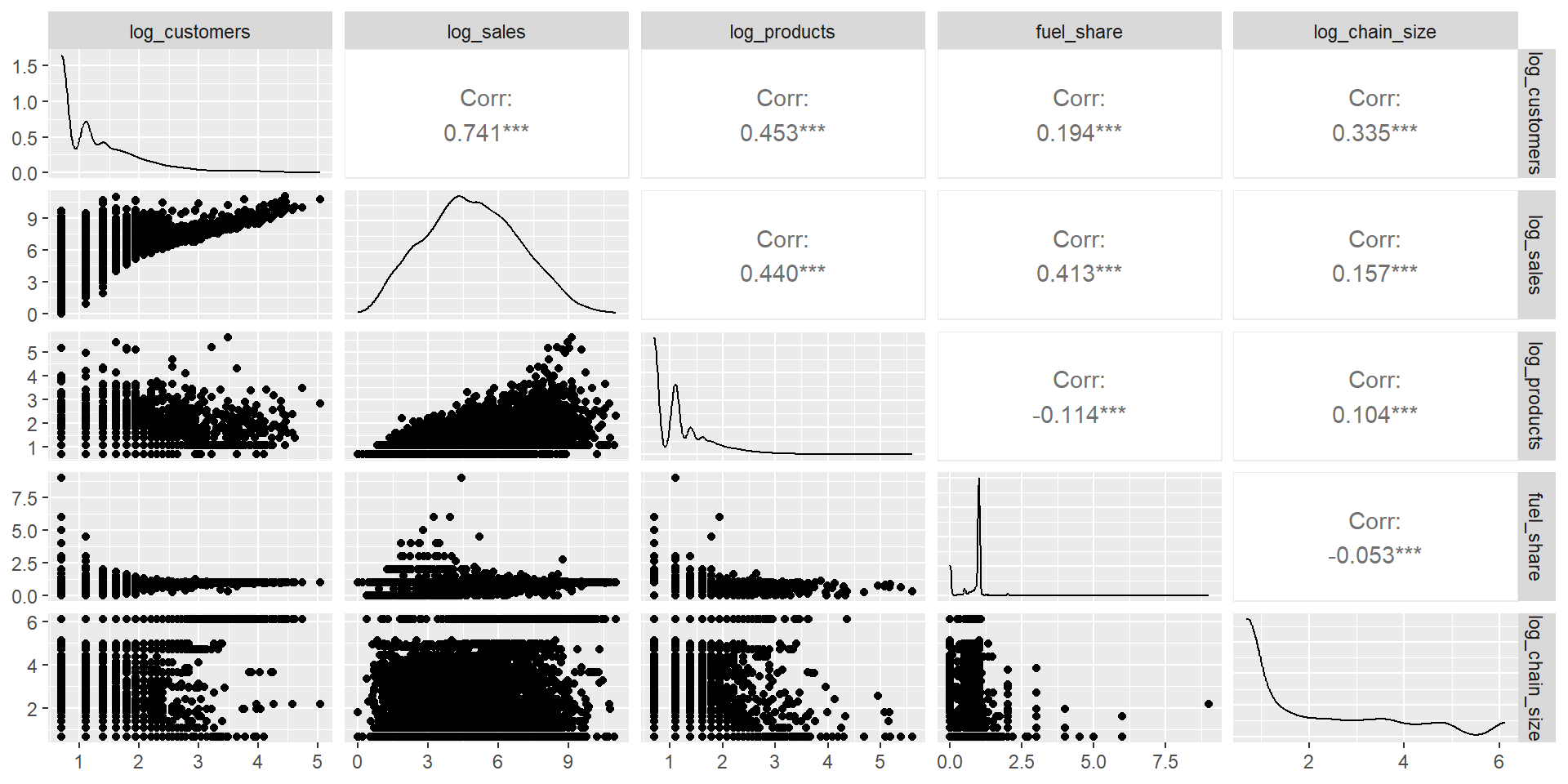 # Run the ggpairs() commandfinal_dataset %>%select(log_customers, log_sales, log_products, fuel_share, log_chain_size) %>%ggpairs()
