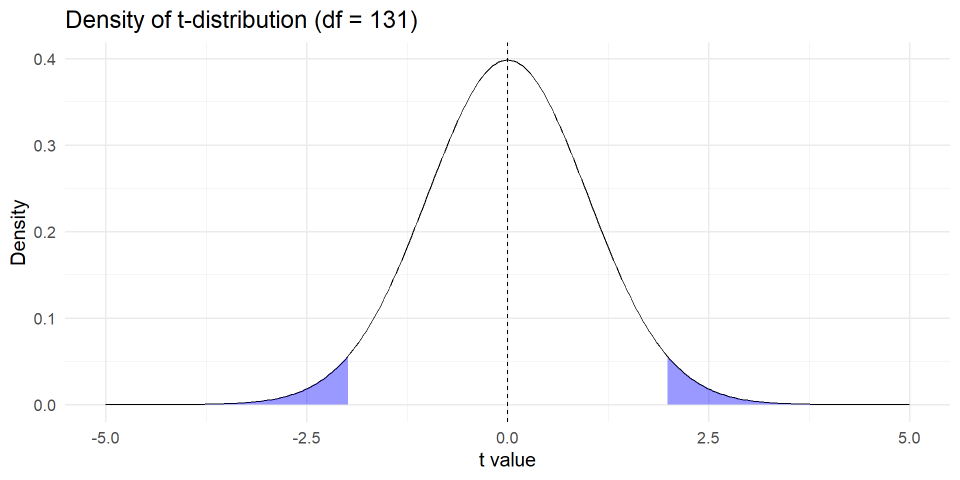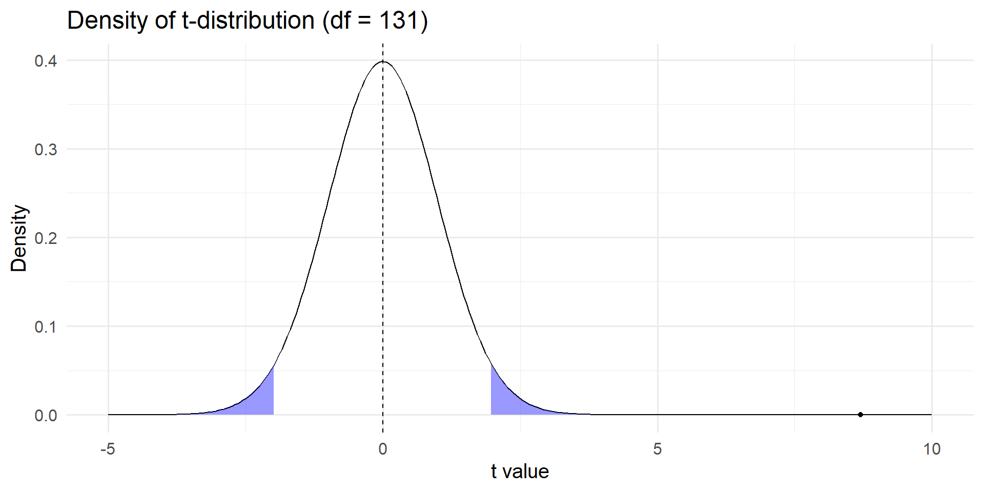 Locating our t-statistic on the density of the t-distribution quantifies the probability that we observe our result by chance (p-val = 1.199041e-14)